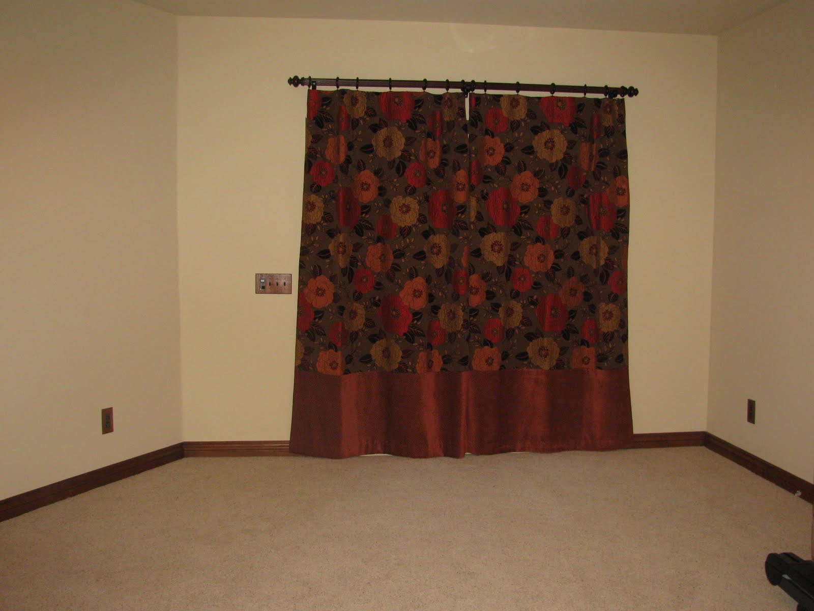 With the upcoming arrival of Baby Max we have had some "rearranging" going on. When we built the house the floor plan called for a separate single car and a half garage. We debated on what to do with that space. We didn't feel that we needed 4 car slots, so we knew we wanted to do something else with it. Gym or guest room was the debate. Gym won, but as it turns out, guest room should have. So Kyle headed up the project of converting our gym (treadmill plus my dinky "girl" free weights room) to a guest room. It's finished. It's been finished for a while, but I was getting curtains to go in there so decided to wait to post pictures. I'll have to post more once we get our guest room furniture moved into there. I must say Kyle did a great job (and I didn't do half bad on the curtains myself *wink*). He picked out/did EVERYTHING. The only thing I did was the curtains.